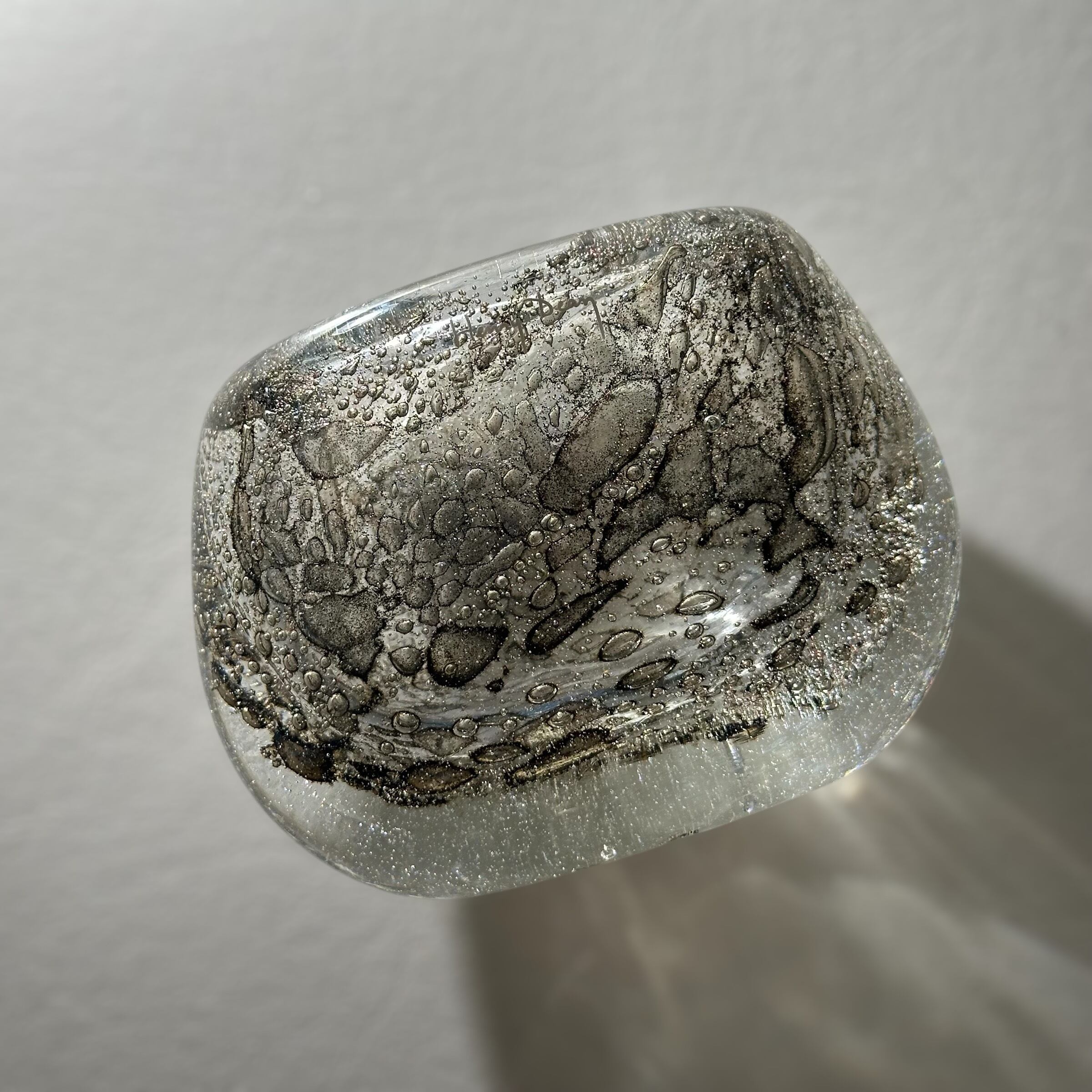 厚みのあるガラスから伝わるずっしりとした重みや、広がる気泡が一つ一つ異なる表情を見せ、ハンドメイドならではの温かみと個性が感じられる一点ものです。
